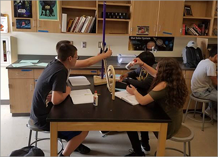 Middle school students applying engineering concepts through hands-on STEM kits.
